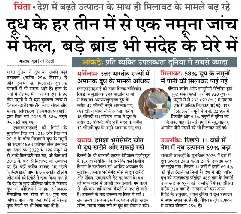 ਨਵੀਂ ਦਿੱਲੀ : ਭਾਰਤ ਦੁਨੀਆ ਵਿੱਚ ਦੁੱਧ ਦਾ ਸਭ ਤੋਂ ਵੱਡਾ ਉਤਪਾਦਕ ਦੇਸ਼ ਹੈ, ਜੋ ਕਿ ਵਿਸ਼ਵ ਦੇ ਕੁੱਲ ਉਤਪਾਦਨ ਵਿੱਚ ਲਗਭਗ 25% ਦਾ ਯੋਗਦਾਨ ਪਾਉਂਦਾ ਹੈ। ਪਰ ਇੱਕ ਚਿੰਤਾਜਨਕ ਖ਼ਬਰ ਇਹ ਸਾਹਮਣੇ ਆਈ ਹੈ ਕਿ ਉਤਪਾਦਨ ਦੇ ਨਾਲ-ਨਾਲ ਦੁੱਧ ਵਿੱਚ ਮਿਲਾਵਟ ਦੇ ਮਾਮਲੇ ਵੀ ਤੇਜ਼ੀ ਨਾਲ ਵਧ ਰਹੇ ਹਨ। ਹਿੰਦੀ ਅਖਬਾਰ ਭਾਸਕਰ ਦੀ ਖਬਰ ਮੁਤਾਬਕ ਤਾਜ਼ਾ ਰਿਪੋਰਟਾਂ ਅਨੁਸਾਰ, ਦੇਸ਼ ਭਰ ਵਿੱਚ ਜਾਂਚੇ ਗਏ ਦੁੱਧ ਦੇ ਹਰ ਤਿੰਨ ਵਿੱਚੋਂ ਇੱਕ ਨਮੂਨਾ ਗੁਣਵੱਤਾ ਦੀ ਜਾਂਚ ਵਿੱਚ ਫੇਲ੍ਹ ਹੋ ਰਿਹਾ ਹੈ।