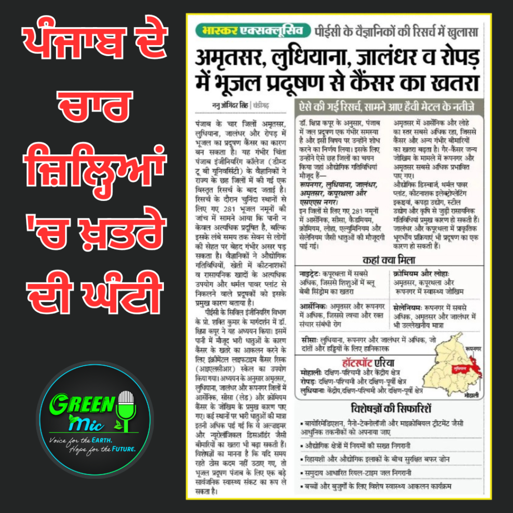 ਚੰਡੀਗੜ੍ਹ: ਪੰਜਾਬ ਇੰਜੀਨੀਅਰਿੰਗ ਕਾਲਜ (PEC) ਦੇ ਵਿਗਿਆਨੀਆਂ ਦੀ ਇੱਕ ਤਾਜ਼ਾ ਰਿਸਰਚ ਵਿੱਚ ਹੈਰਾਨ ਕਰਨ ਵਾਲੇ ਖੁਲਾਸੇ ਹੋਏ ਹਨ। ਰਿਪੋਰਟ ਅਨੁਸਾਰ ਪੰਜਾਬ ਦੇ ਚਾਰ ਪ੍ਰਮੁੱਖ ਜ਼ਿਲ੍ਹਿਆਂ— ਅੰਮ੍ਰਿਤਸਰ, ਲੁਧਿਆਣਾ, ਜਲੰਧਰ ਅਤੇ ਰੋਪੜ— ਵਿੱਚ ਜ਼ਮੀਨ ਹੇਠਲਾ ਪਾਣੀ ਇੰਨਾ ਜ਼ਹਿਰੀਲਾ ਹੋ ਚੁੱਕਾ ਹੈ ਕਿ ਇਸ ਨਾਲ ਕੈਂਸਰ ਵਰਗੀ ਭਿਆਨਕ ਬਿਮਾਰੀ ਦਾ ਖ਼ਤਰਾ ਕਾਫ਼ੀ ਵਧ ਗਿਆ ਹੈ। ਡਾ. ਸ਼ਿਪਰਾ ਕਪੂਰ ਦੀ ਅਗਵਾਈ ਹੇਠ ਹੋਈ ਇਸ ਖੋਜ ਵਿੱਚ ਪਾਣੀ ਦੇ 281 ਨਮੂਨਿਆਂ ਦੀ ਜਾਂਚ ਕੀਤੀ ਗਈ, ਜਿਸ ਵਿੱਚ ਭਾਰੀ ਮਾਤਰਾ ਵਿੱਚ ਘਾਤਕ ਧਾਤਾਂ (Heavy Metals) ਪਾਈਆਂ ਗਈਆਂ ਹਨ।